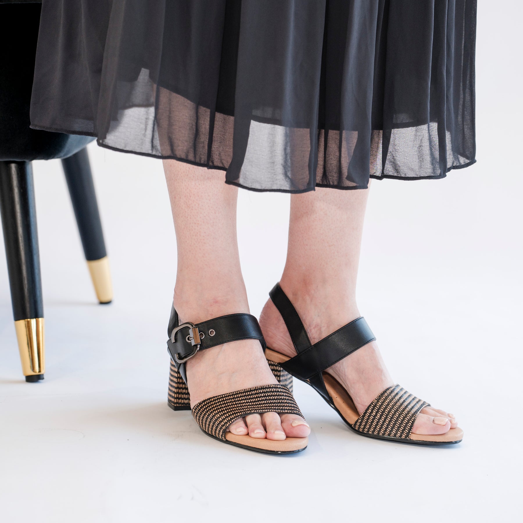 - True to Size: Order your usual size. Heel height is 6.5cm. Buckled strap is elasticised for extra flexibility.