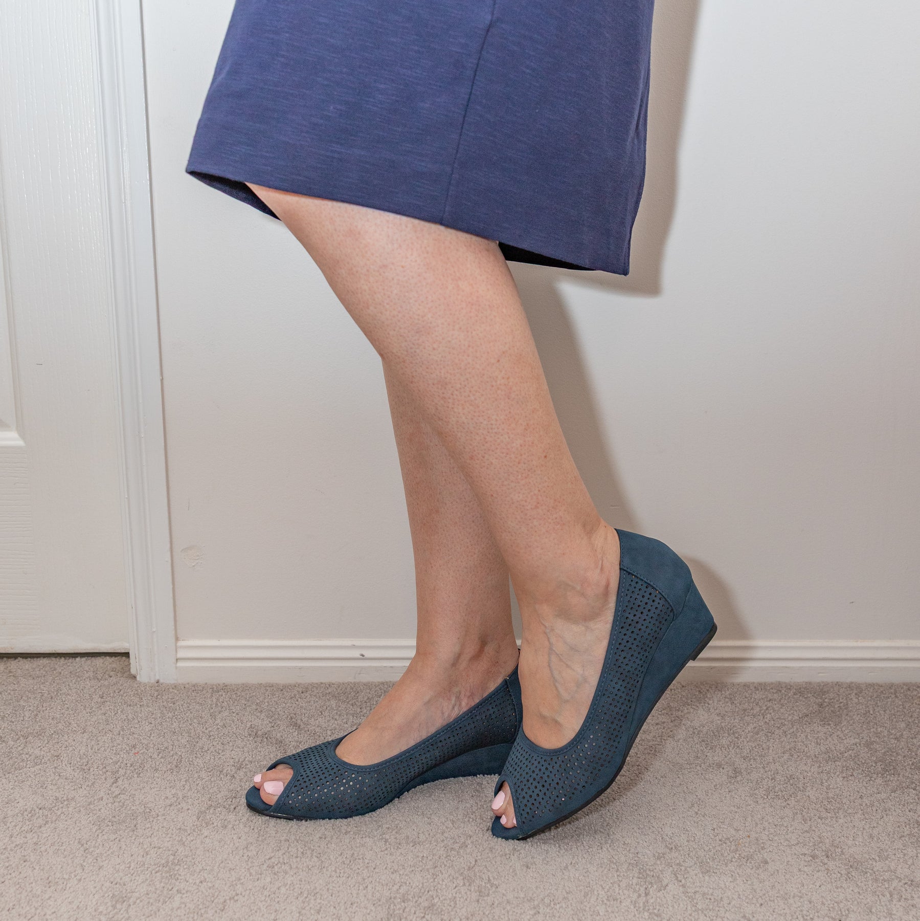 Non-leather, suede-feel, perforated peep toe upper for breathability and comfort