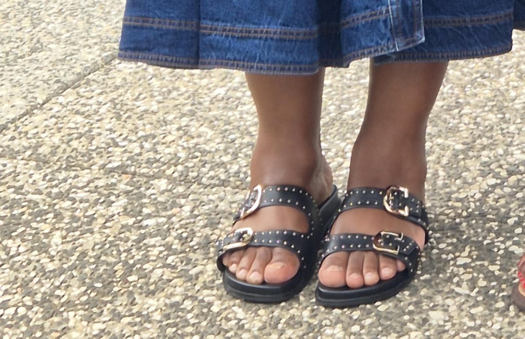Love these slides. The gold studs abd hardware gives them a high-end edgy look thar elevates a basic outfit. The molded footbed makes them comfortable to wear day long. Trie to size and looks great!