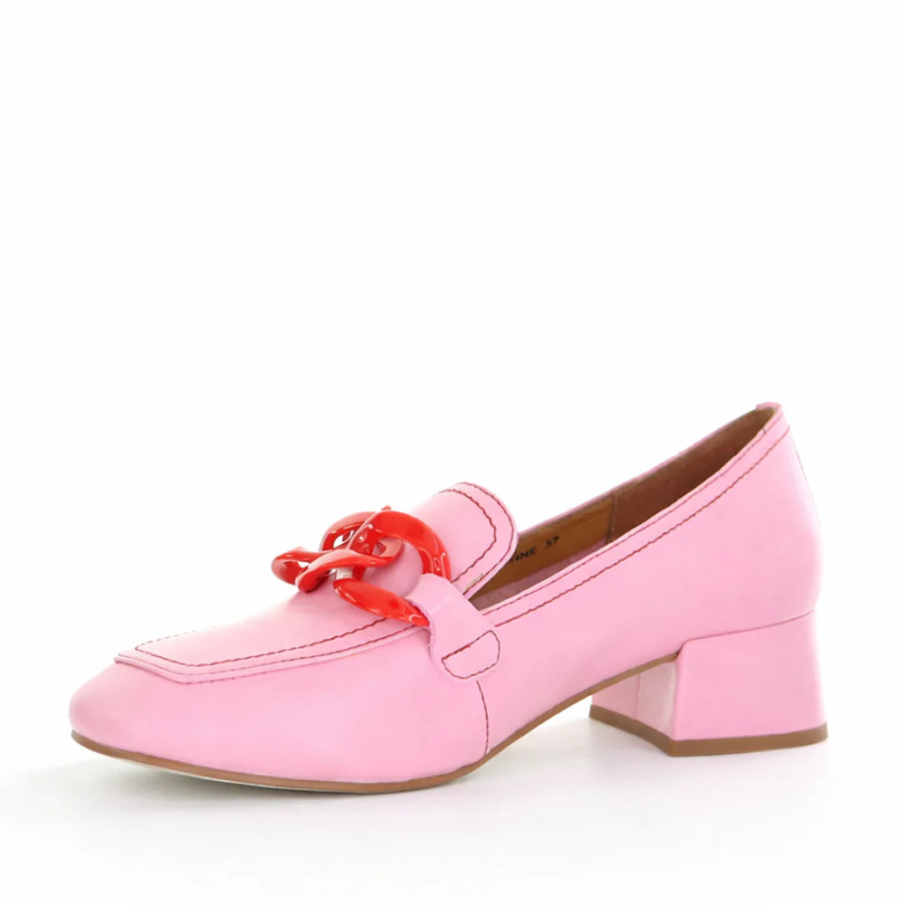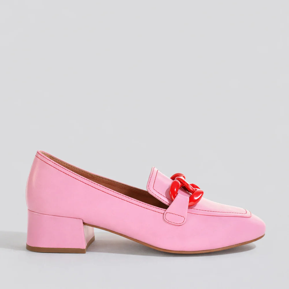 Crafted from premium leather, Daphne features a sleek slip‑on silhouette enhanced by a contrasting red bold chain detail across the vamp, adding just the right amount of edge. The structured block heel (approx. 4.5cm) offers a subtle lift without sacrificing stability, making this style ideal for long workdays or weekend wandering. Fully leather‑lined for breathable comfort and finished with a durable outsole, Daphne is made to move with you — wherever the day takes you.