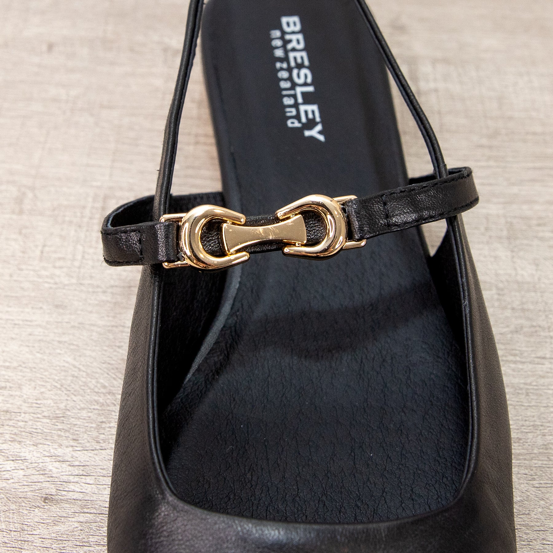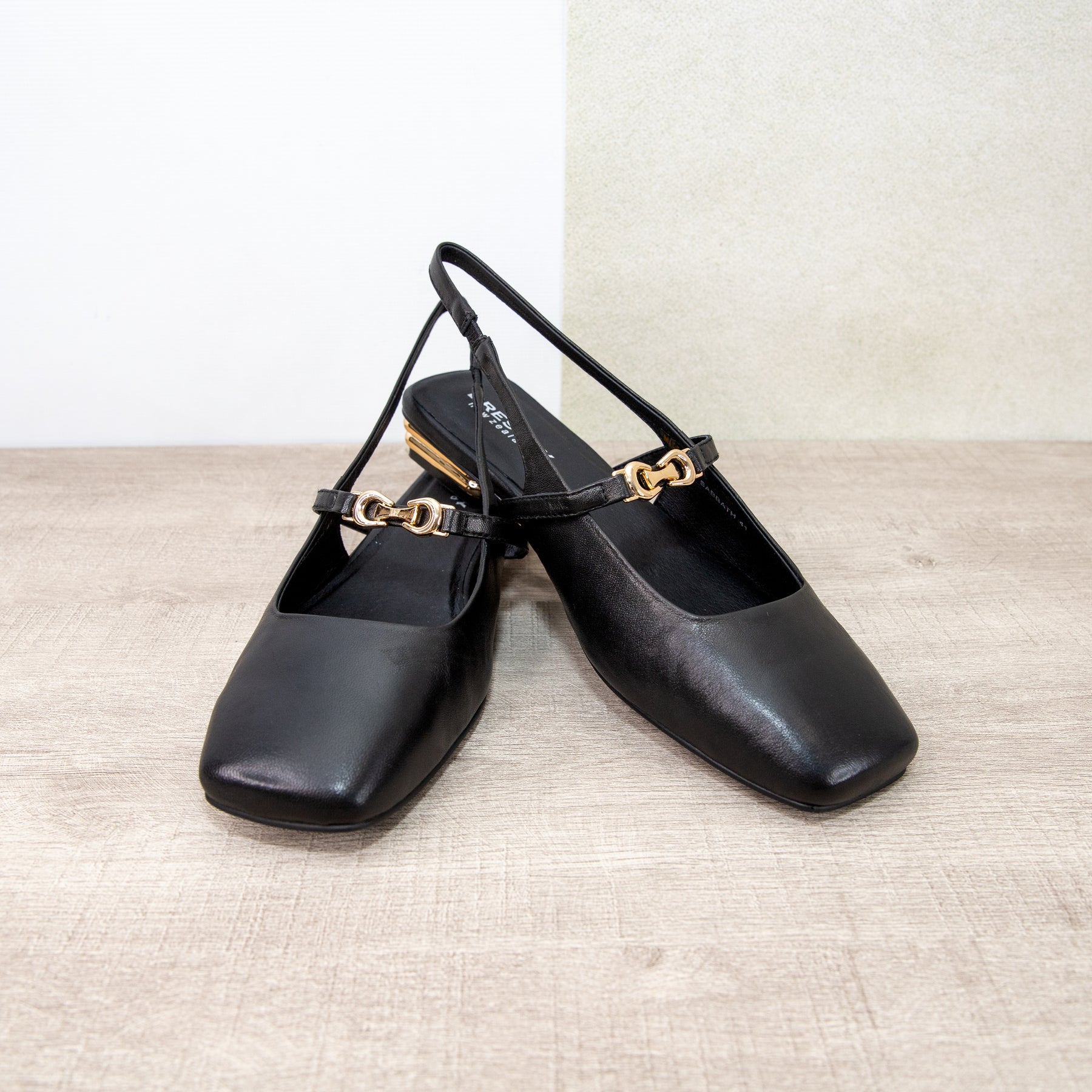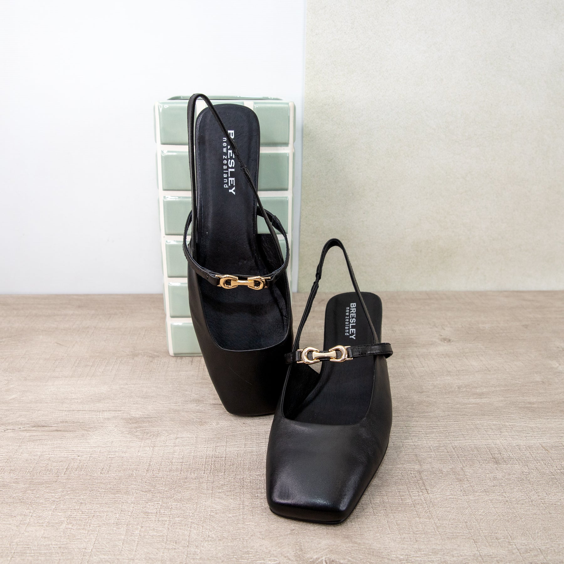 Meet Sabbath in Black: the sandal that whispers elegance and delivers confidence. Crafted in rich black leather, this design features a refined square toe, a subtle low-heel and a sleek gold chain detail across the vamp that catches the light just enough to say “I’m dressed for purpose.”