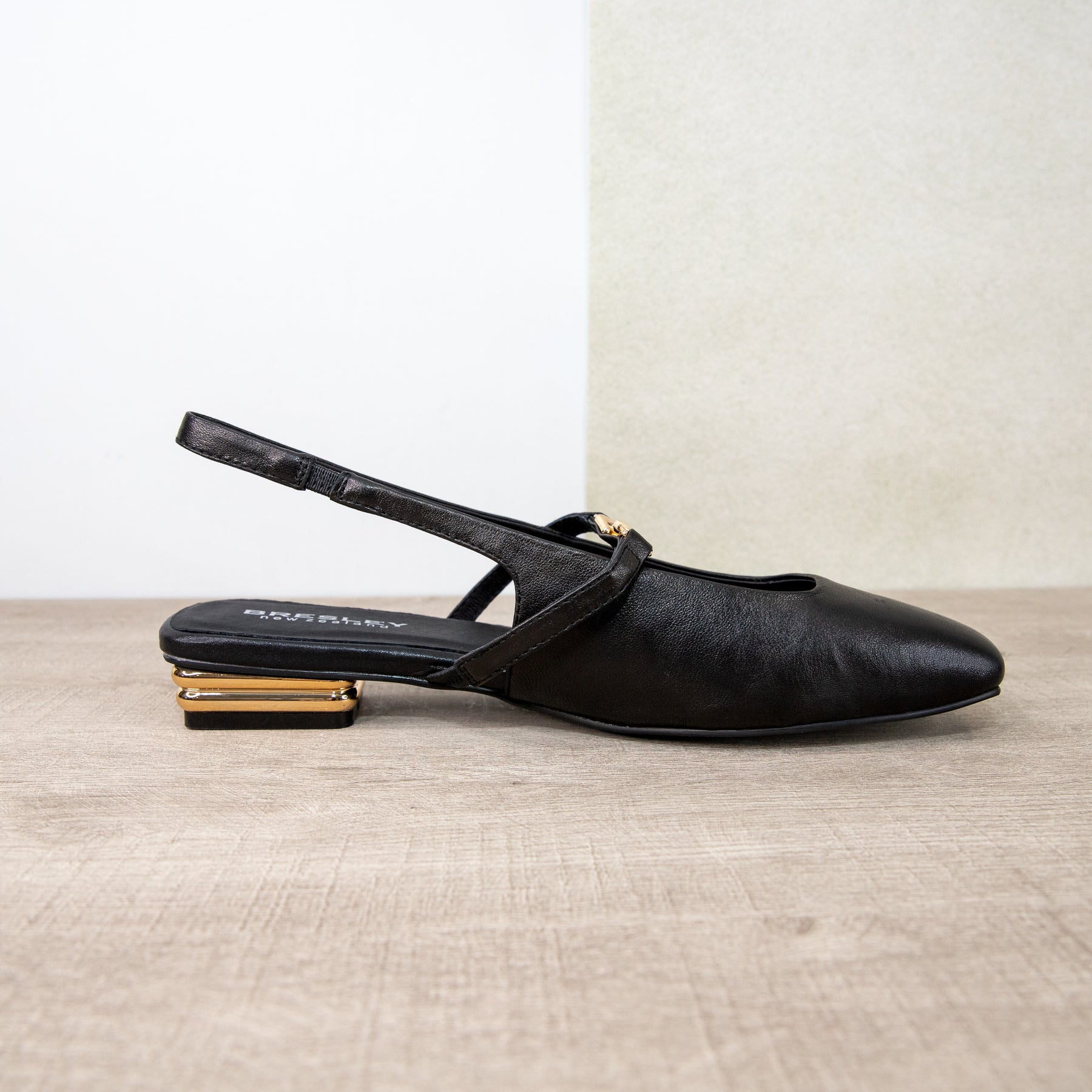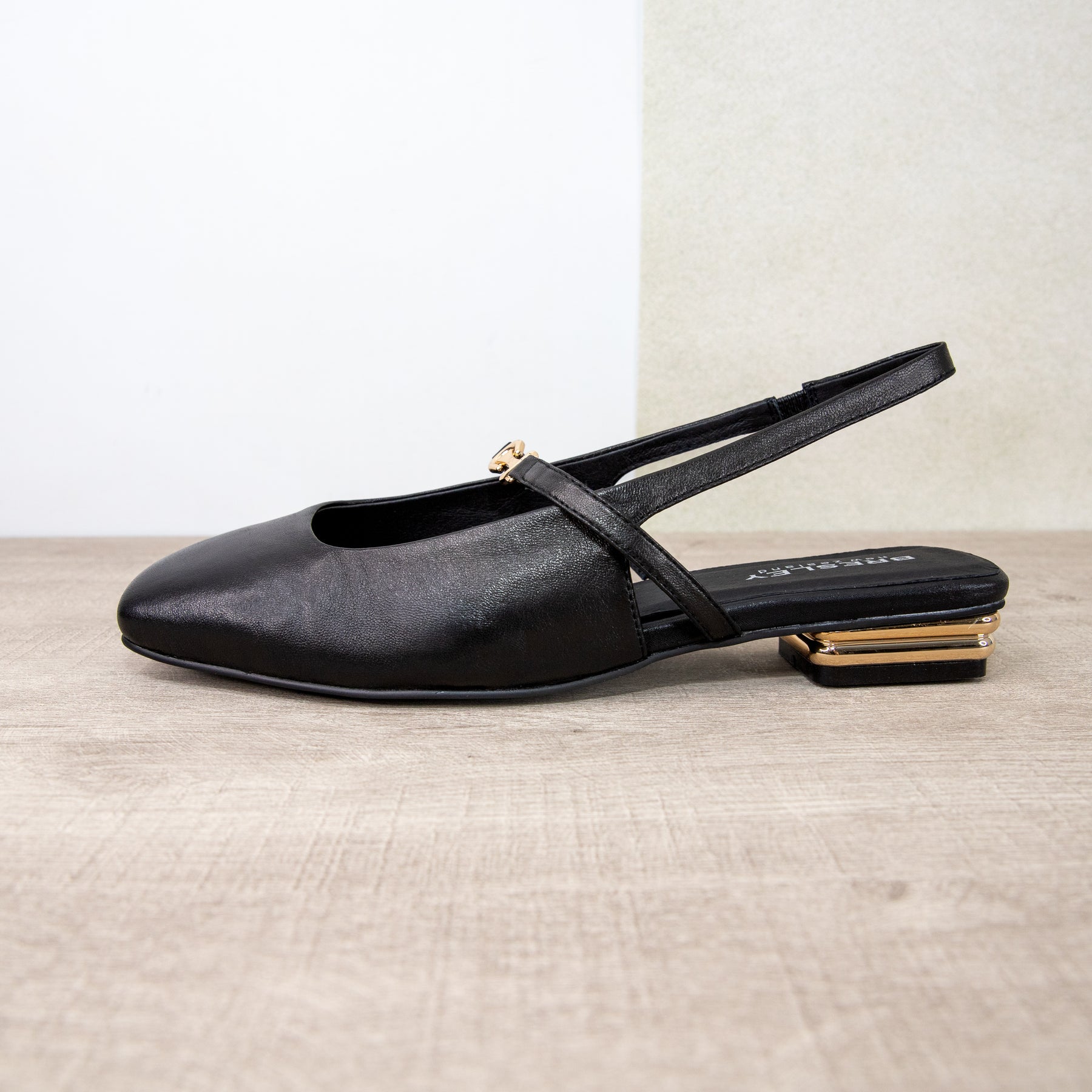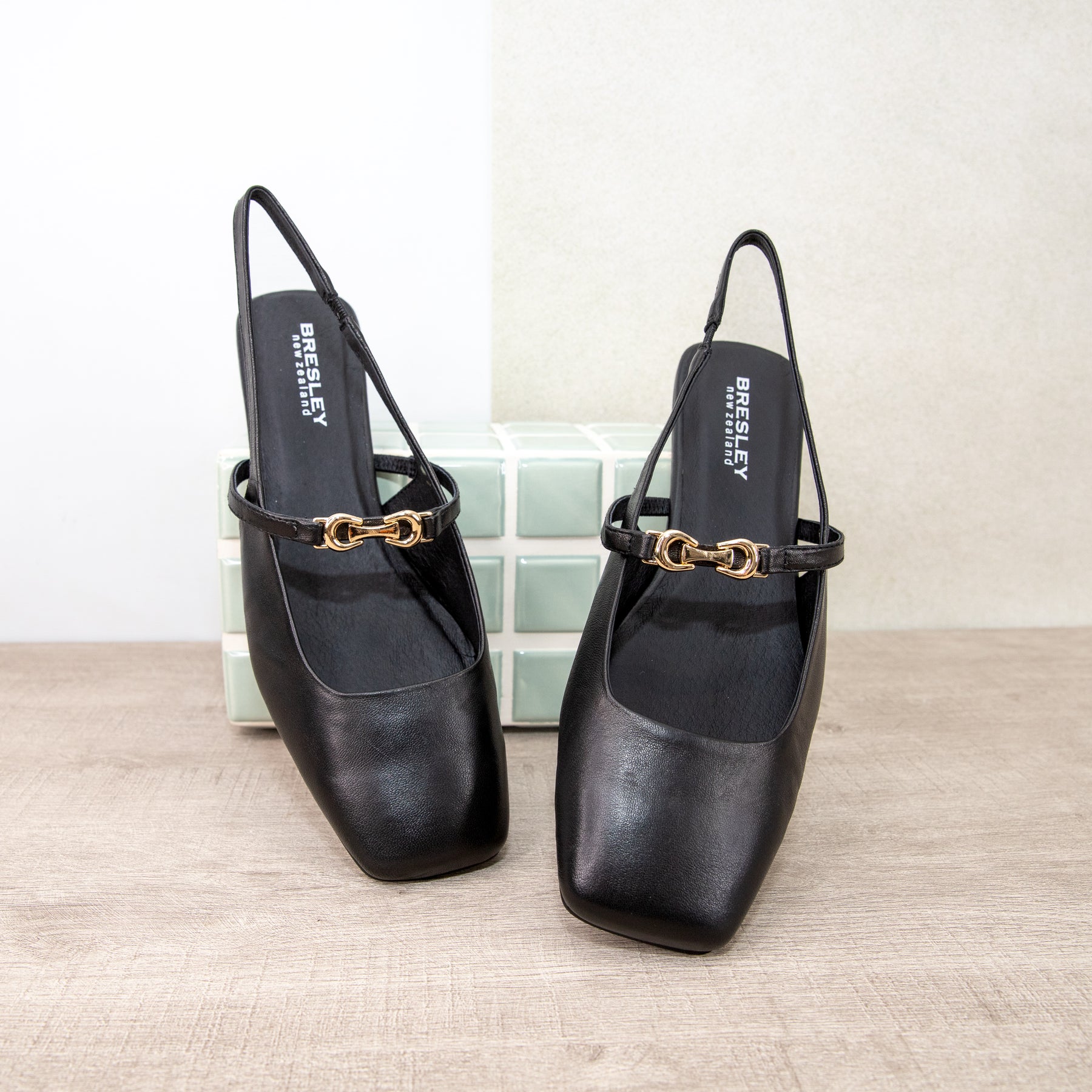 Meet Sabbath in Black: the sandal that whispers elegance and delivers confidence. Crafted in rich black leather, this design features a refined square toe, a subtle low-heel and a sleek gold chain detail across the vamp that catches the light just enough to say “I’m dressed for purpose.”