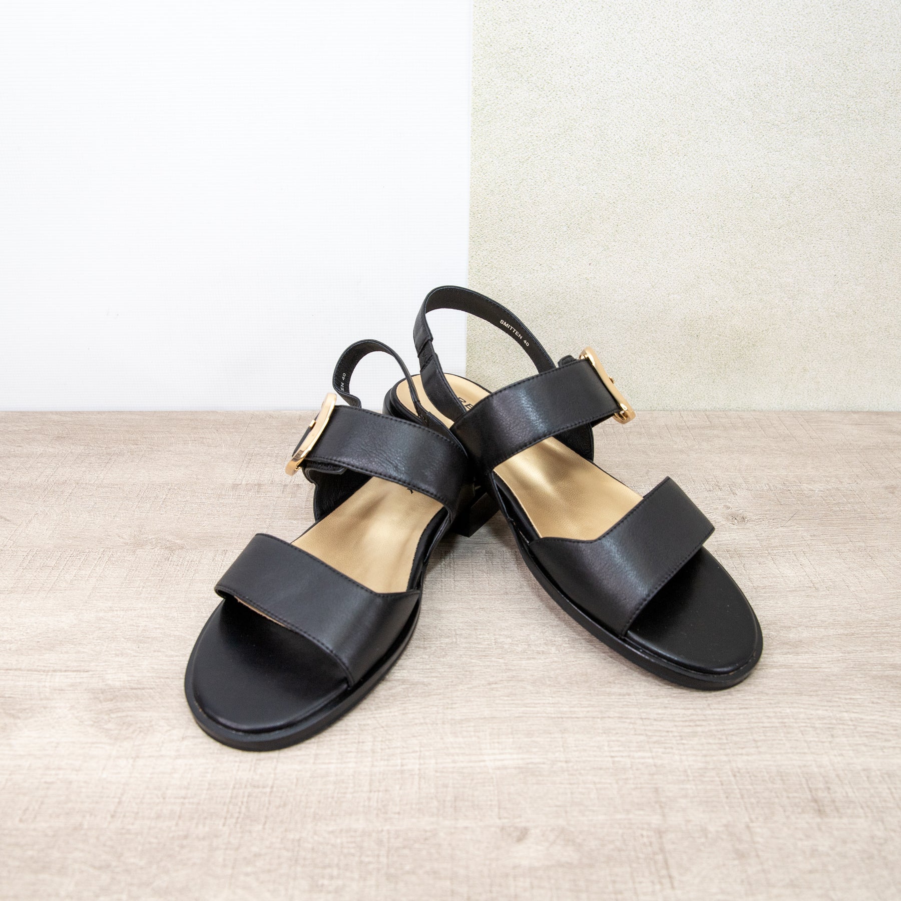 Bold, beautiful and endlessly wearable — Smitten in Black is your go-to when you want to stride into style land without overthinking. Smooth black leather, the signature wide front strap and gold-tone accent buckle give her elegance with attitude. The sling-back keeps her secure, the low block heel keeps her wearable all day long. Wear her under tailored black trousers and a blazer for power dressing, or let her peek out from beneath a midi skirt for evenings that demand comfort plus chic. Sophisticated, yes. Safe? Never.