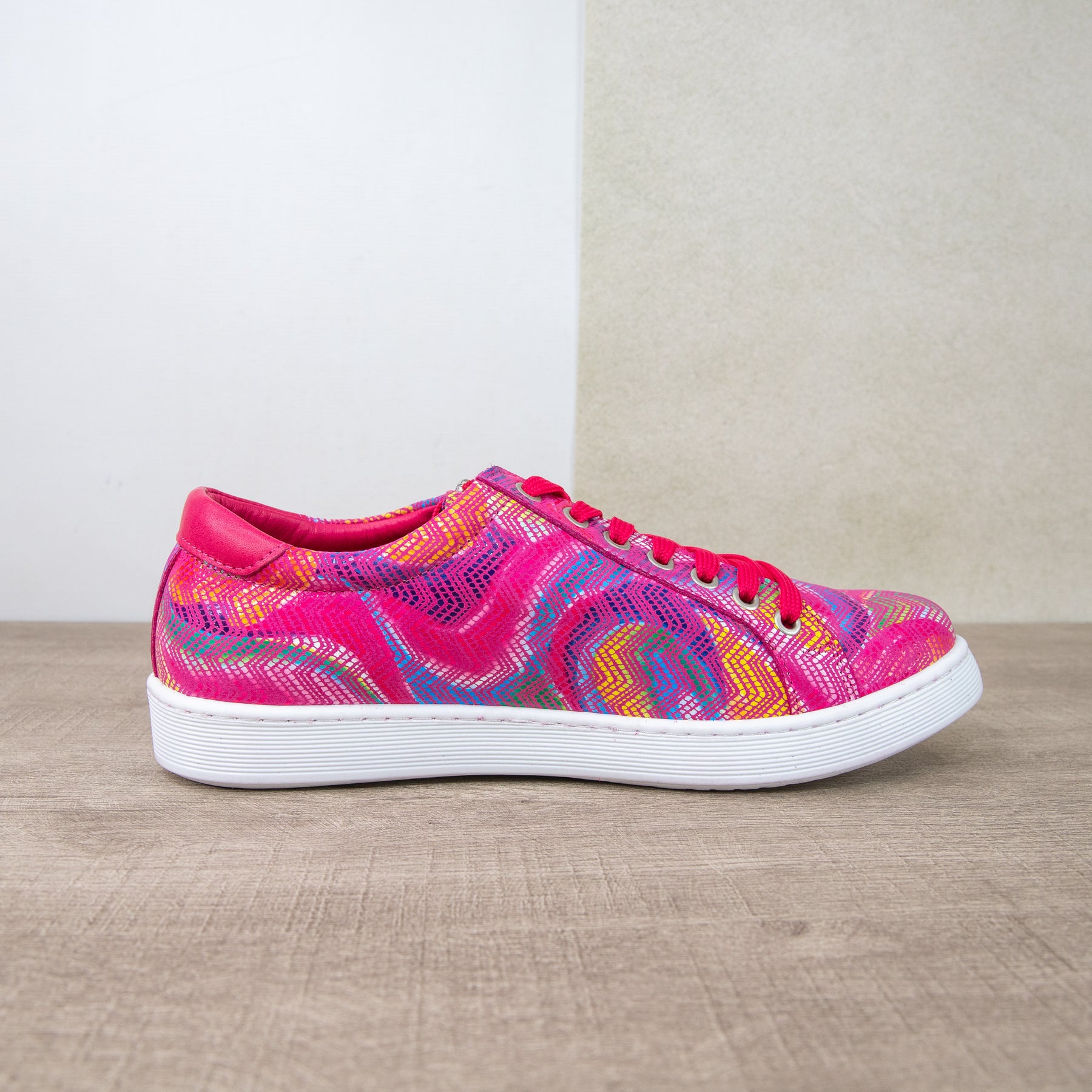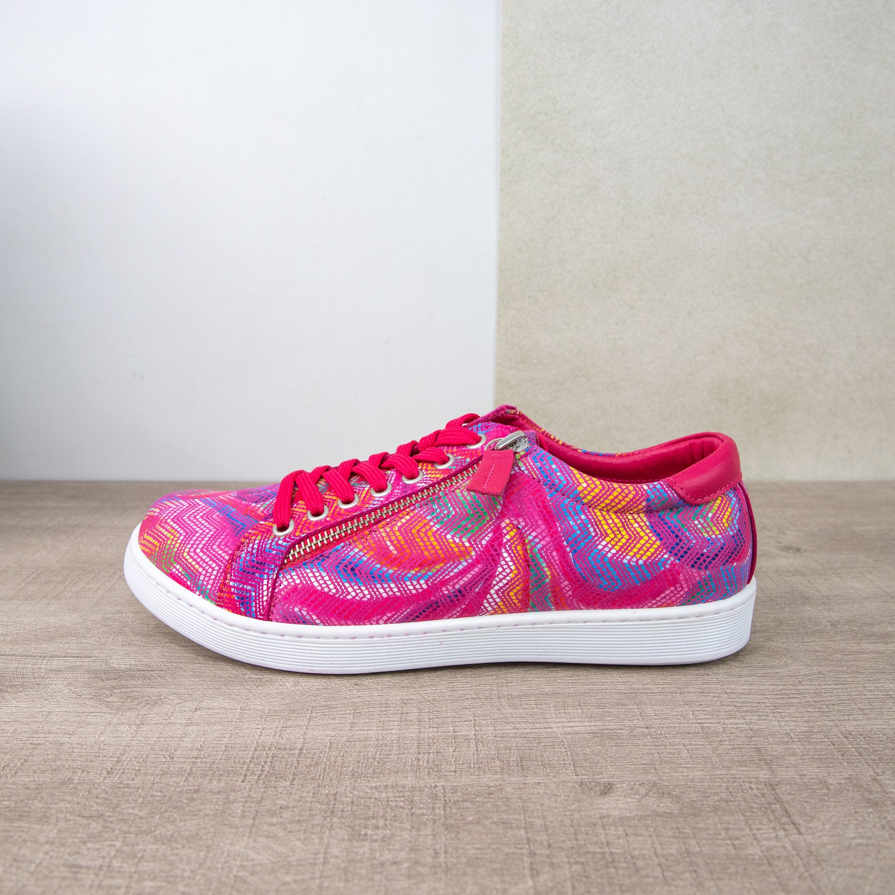 Meet the Rilassare Token “Magenta Rainbow” — your daily dose of colour therapy in sneaker form. Soft-as-a-hug European leather wraps your foot, while a quick side-zip means you’re out the door before the kettle boils. Tie the laces once, zip, and boom: instant happy feet. Orthotic-friendly cushioning keeps every step cloud-soft, and that gentle 2 cm lift gives you a little bounce without trying. Handcrafted comfort, splashy good vibes — these are the “wear with everything, smile at everyone” kicks.